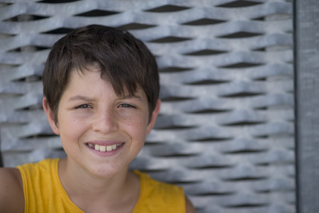 Happy six year old Caucasian boy portrait over grey background. White European kid widely smiling and looking into the camera