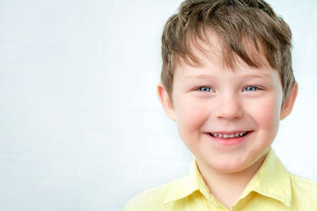 portrait of a happy, smiling blue-eyed boy 4-5 years old. A child on a light background in a yellow shirt. horizontal photo.