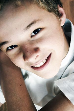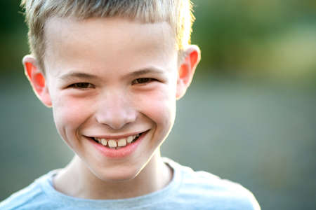 Handsome teenager guy 16-18 years old smiling and looking at the camera. Close up emotional portrait of caucasian young man