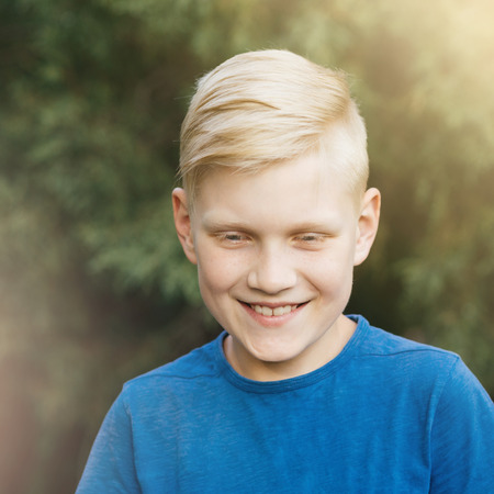Stylish blond teen boy 14-16 year old over green nature background closeup. Looking at camera. Tenagerhood.