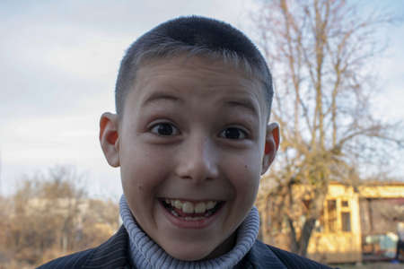 A portrait of happy kid boy with curly hair. Children and emotions koncept