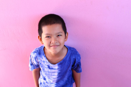 A cheerful boy smiles joyfully in front of a vibrant pink wall, showcasing youthful innocence and a playful spirit with his casual tie-dye shirt.
