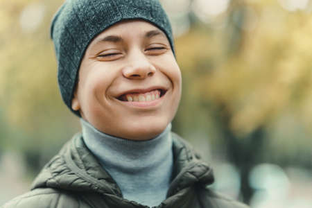 Boy in a hat is smiling in the autumn park. Bright colour background. Close up portrait of a cheerful boy.
