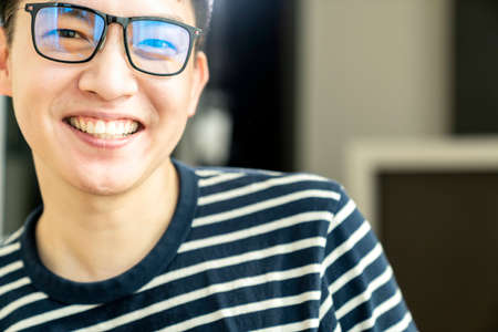 close up asian portrait attractive male smile with cheerful confident whie work from home with laptop relax and casual lifestyle asian male peaceful working quarantine white coronavirus spread