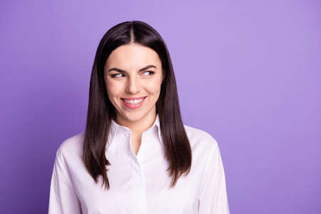 Photo of young charming girl wondered look empty space thoughtful isolated over violet color background