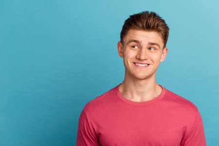 Photo of young cheerful man curious thoughtful look empty space dream idea isolated over blue color background