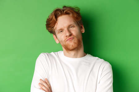 Emotions and fashion concept. Close-up of skeptical young man with red hair and beard pucker lips, looking at camera as waiting for something, standing over green background