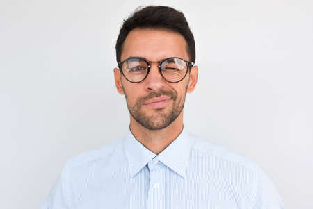 Portrait of unshaven handsome male frowns, being dissatisfied with something, blink with eye, wears round glasses and blue shirt, isolated over white studio background. People and emotion concept.