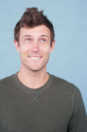 portrait of a handsome young man looking up isolated on a blue background