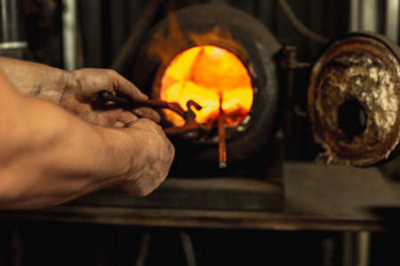 Close-up of blacksmith manually forging the molten metal in the workshop