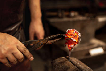 Beautiful rose. Blacksmith manually forging molten metal on anvil in smithy with spark fireworks. Concept of labor, retro professions, family business