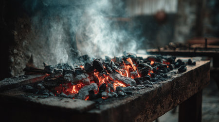 A close-up view of glowing charcoal and rising smoke from a blacksmith forge. This image captures the essence of traditional craftsmanship and the art of metalworking.