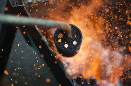 Blacksmith forge oven with hot flame. Smith heating iron piece of steel in fire of red-hot forge with tools