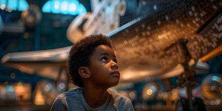 A curious Black child gazes up at a space shuttle during a museum visit. Concept African American representation, Space education, Childhood wonder, Learning through experience, Museum field trip