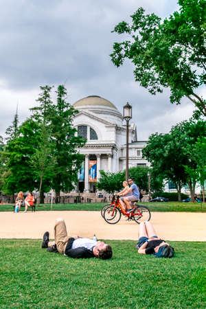 Couple of tourists resting on the lawn of the Washington Mall