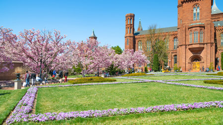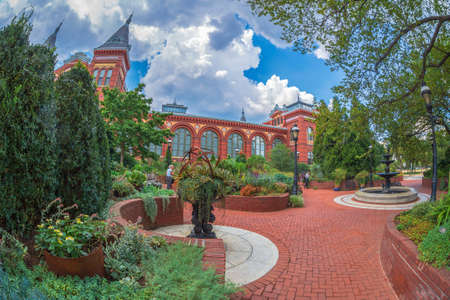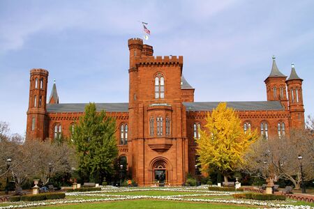 WASHINGTON DC, USA - SEPTEMBER 4, 2018: Victorian facade of the Smithsonian Castle, Arts & Industries Building, with beautiful garden in foreground, located on National Mall.