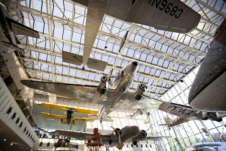 Washington DC, Aug 26: Douglas DC-3 is a fixed-wing propeller-driven plane hangs on display at the Smithsonian Natural Air and Space Museum on August 26 2014, Washington DC, USA.
