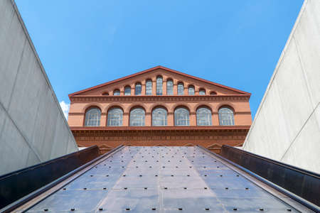 Red brick structure of National Building Museum against a clear blue sky in Washington DC, USA. Italian Renaissance architecture of museum building in autumn.