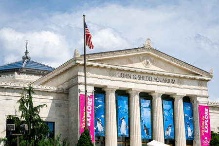 The Shedd Aquarium Chicago with American Flag