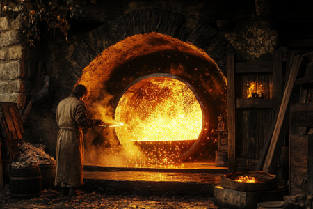 Blacksmith engaged in forging metal within a glowing forge, highlighting traditional craftsmanship and the artistry involved in metalworking