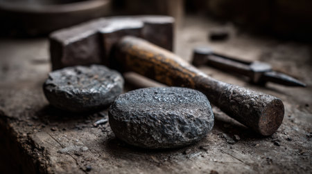 In a setting with ancient tools, stone and bronze objects lay on a rough table, reflecting various eras of craftsmanship and usage.