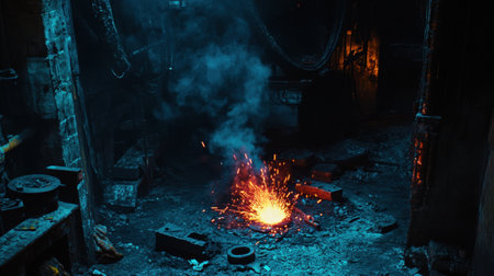 A striking image of brightly colored sparks emerging from a metalworking process, surrounded by a dark, industrial environment filled with debris and smoke.