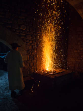 Old man working with metal in workshop. Sparks fly out of the furnace.