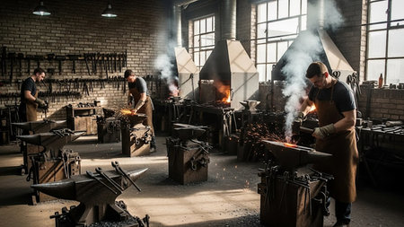 AI Generative Man blacksmith forging metal in manufactory forge, handmade from steel and iron