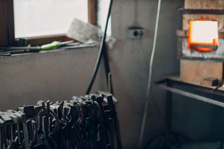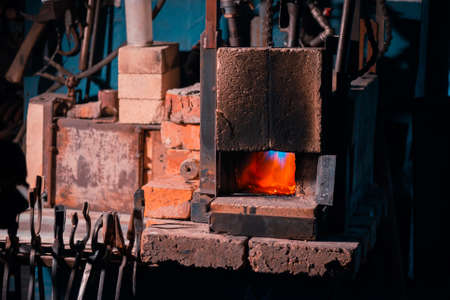Blacksmith forge oven with hot flame. Smith heating iron piece of steel in fire of red-hot forge with tools