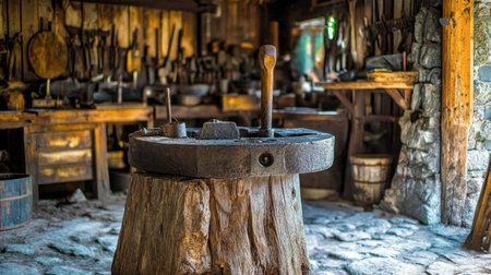 A vintage blacksmith workshop features a rustic anvil on a wooden stump, surrounded by tools and equipment. The scene captures the essence of traditional craftsmanship.