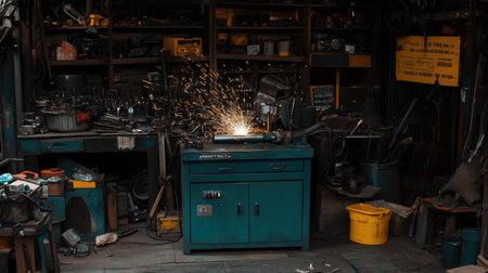 This image depicts a vibrant workshop scene, filled with tools and equipment. Sparks fly from a metalworking process, showcasing the dynamic energy of craftsmanship.