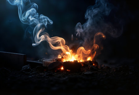 A captivating image showcasing bright flames and flying sparks from a charcoal bed in an artisan forge, illustrating the intense heat and craftsmanship of blacksmithing.