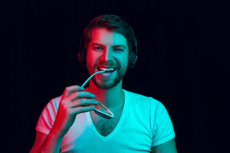 Enjoying his favorite music. Happy young stylish man in sunglasses with headphones listening sound and smiling while standing against blue neon background