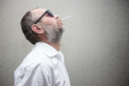 A man in a shirt with a beard in glasses smokes a cigarette