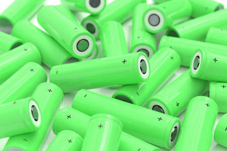 Lots of green cylindrical rechargeable batteries on a white table. Galvanic cells for electrical devices