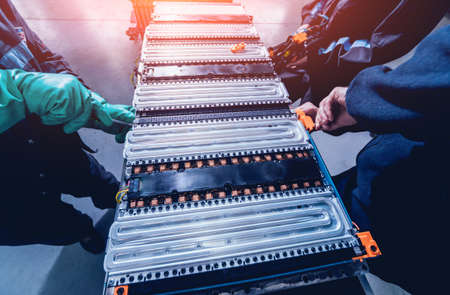 Charging the batteries of the elecric motor. Disassembling the battery of an electric vehicle engine. Car service