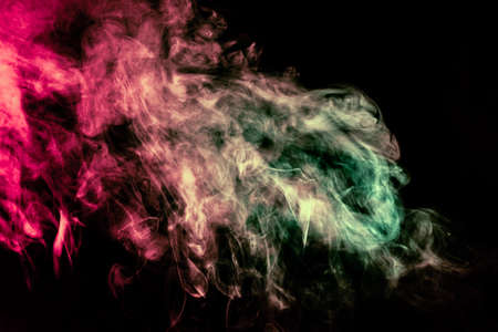 Beautiful column of smoke in the neon bright light of red, green, pink and turquoise on a black background exhaled out of the vape. Nice pattern for printing and backdrop of colored waves.
