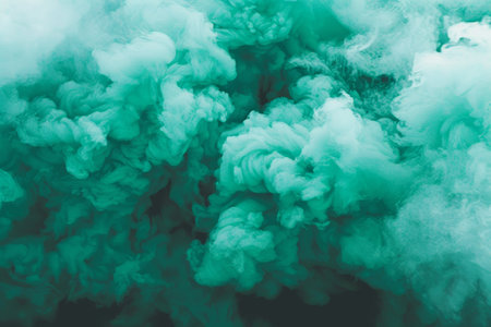 A dramatic burst of green smoke spreads over a black background, creating a striking contrast. A swirling, cloud like formation reflects the dynamic movement and intensity of the explosion.