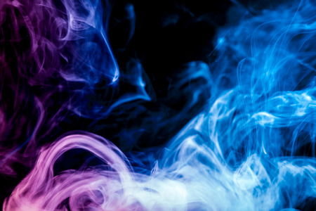 Dense multicolored smoke of blue and pink colors on a black isolated background. Background of smoke vape