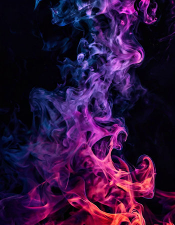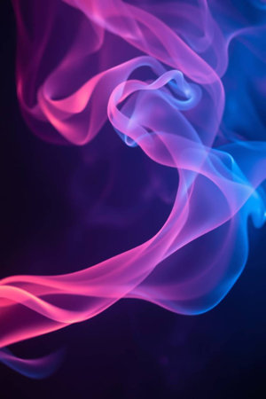 Artistic composition of swirling smoke in vivid neon pink, blue, and orange tones, creating a dynamic and surreal visual effect.