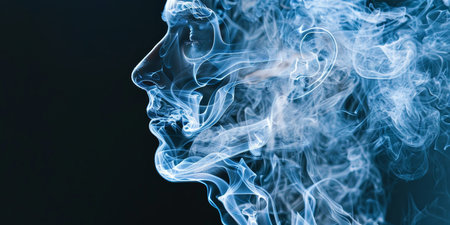A person's face is shown in a blue haze, with smoke surrounding them. Concept of mystery and confusion, as the person's features are obscured by the smoke