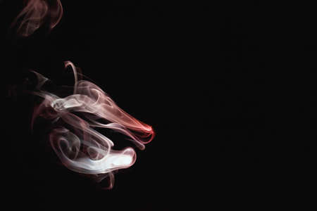 Red smoke on a black background. Colored smoke. Incense stick smoke, illuminated by red light.