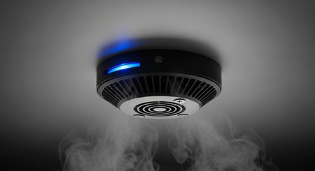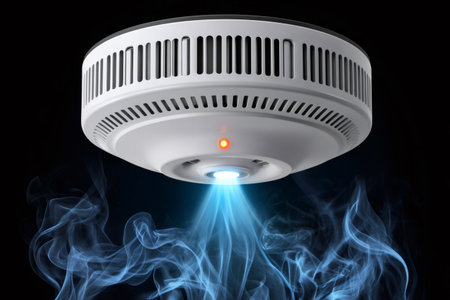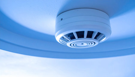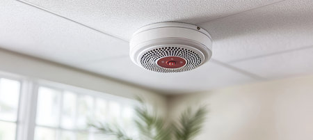 A smart smoke detector with a glowing indicator light on a ceiling, symbolizing home safety automation. Clean space for text.