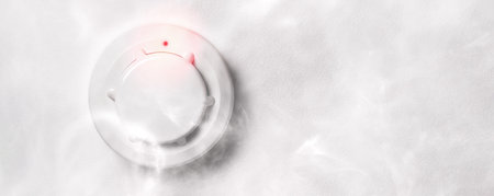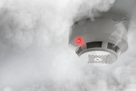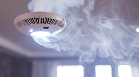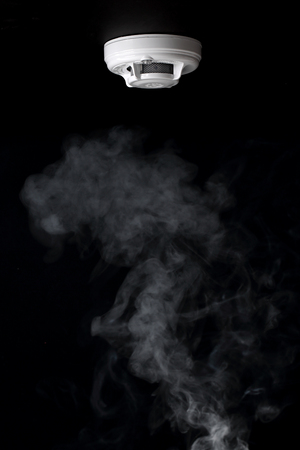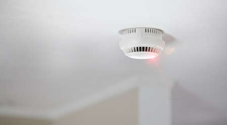 Smoke detector mounted on ceiling with white smoke, red warning light and space for copy
