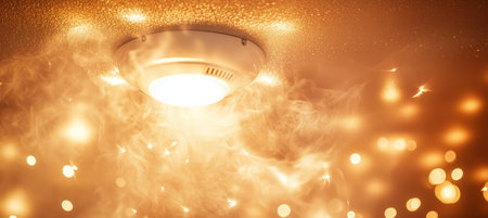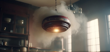 White Smoke Alarm Activated, Theatrical Smoke, Warm Lighting, And Shallow Depth Of Field.