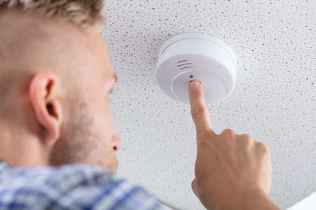 Close-up Of Male Electrician Hand Holding Smoke Detector