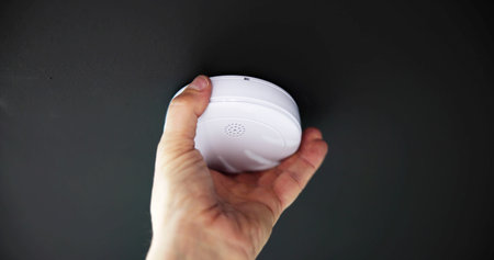 Person's Hand Installing Smoke Detector On Ceiling Wall At Home