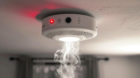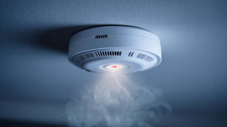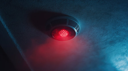 A smoke detector mounted on the ceiling activates with a red light, displaying smoke detection and ensuring home safety. Essential for fire prevention and emergency response.