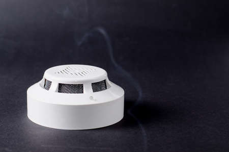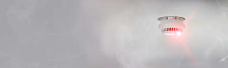 Smoke and fire detector on white ceiling of home with smoke in the foreground. White electronic device detecting house fire in action. Home or office safety concept.