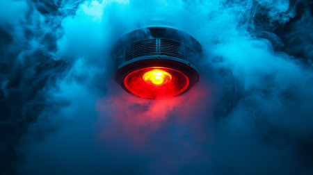 Smoke detector with red warning light amidst swirling blue smoke, safety concept